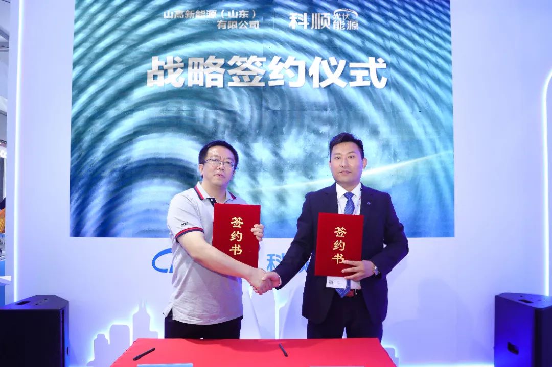展會期間,科順股份與科大鈉能(上海)新能源發展有限公司、江蘇華能智慧能源供應鏈科技有限公司、山高新能源集團有限公司,正式簽署戰略協議,合作推動“光伏+防水+儲能”新布局落地。