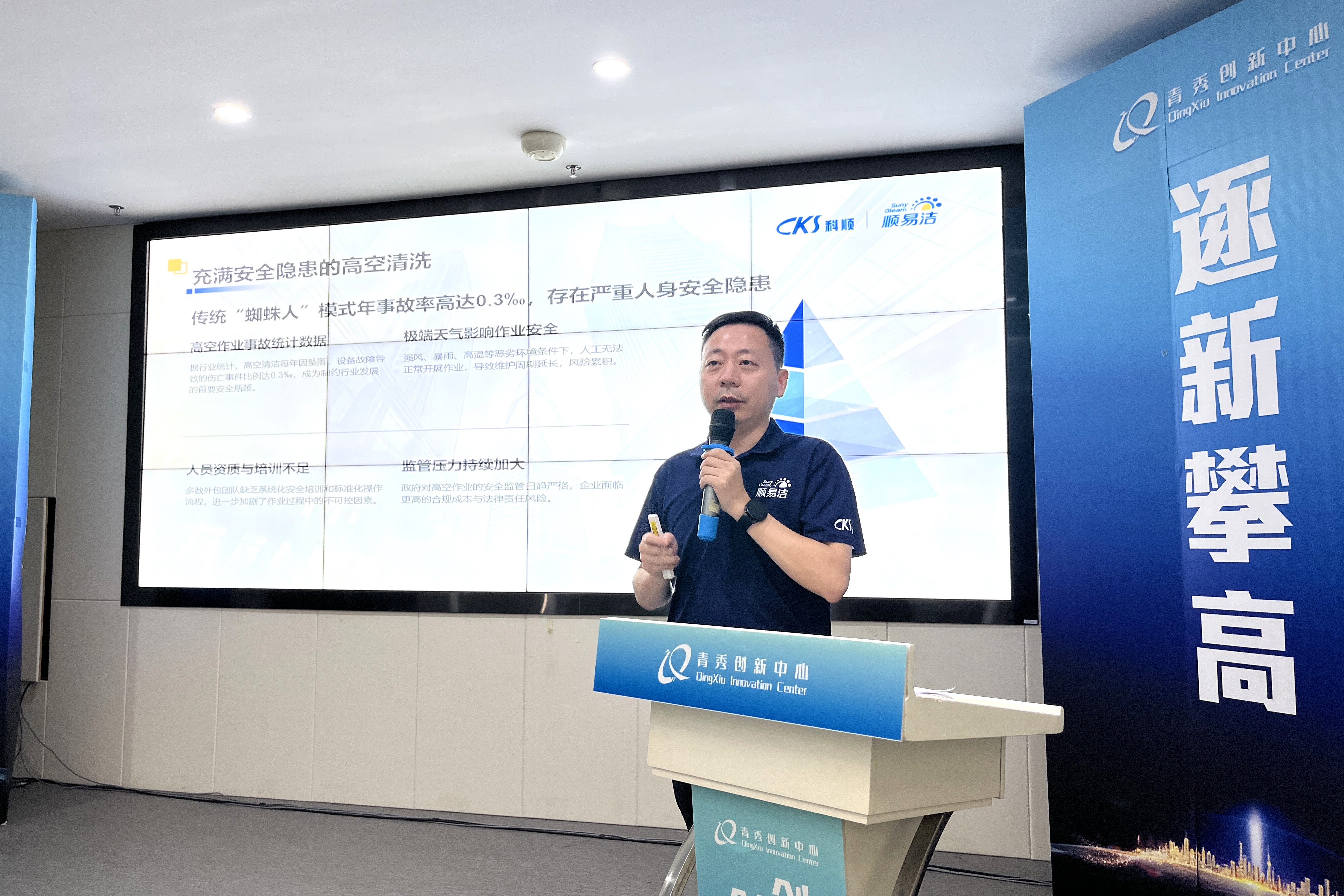 廣西電子學會低空專委會理事長錢健,通過指出高空清洗領域的兩難困境,強調科順「順易潔」與御智領創的合作,結合無人機精準控制與納米涂層防護,規避人工風險、提升效率,是低空經濟服務產業的典范。