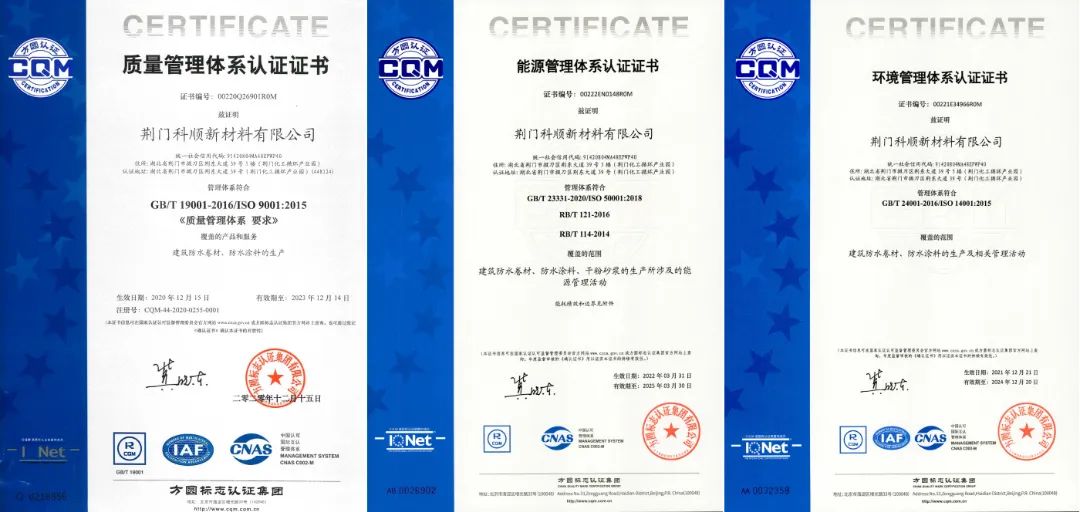 科順股份及荊門科順以質量促發展,強化生產經營管理,通過了質量管理體系認證、能源管理體系認證、環境管理體系認證、安全生產標準化三級企業等,為市場和客戶提供優質產品和服務保障。