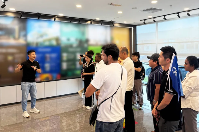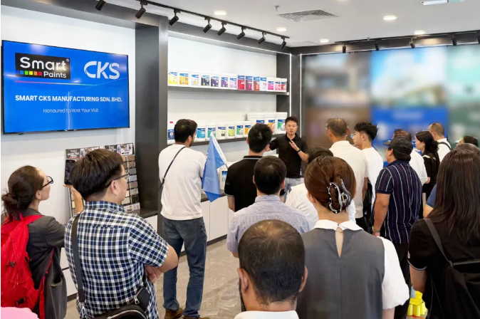 The delegation first toured the factory exhibition hall. With a professional introduction by Project Manager Sean Tan, the delegation gained detailed insights into Keshun’s waterproof coatings and architectural coatings, as well as their application cases in residential buildings, urban complexes, and other fields.